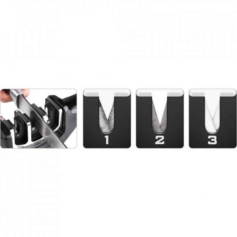 3-stupňový brúska na nože vyrobený z ABS plastov sa soft úpravou a protišmykovou základňou.Brúsne kotúče: diamantový kameň pre opravy poškodených ostrie a rovnanie pred ich zaostrovaním, volfrámový nerezový kotúč zostruje čepeľ a obnoví ostrie do tvaru "V" a keramický kameň leští čepeľ a vyrovnáva všetky povrchové nerovnosti.