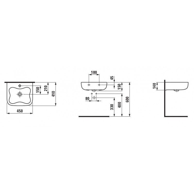 Umývadielko s 1 otvorom pre batériu uprostredRozmery: