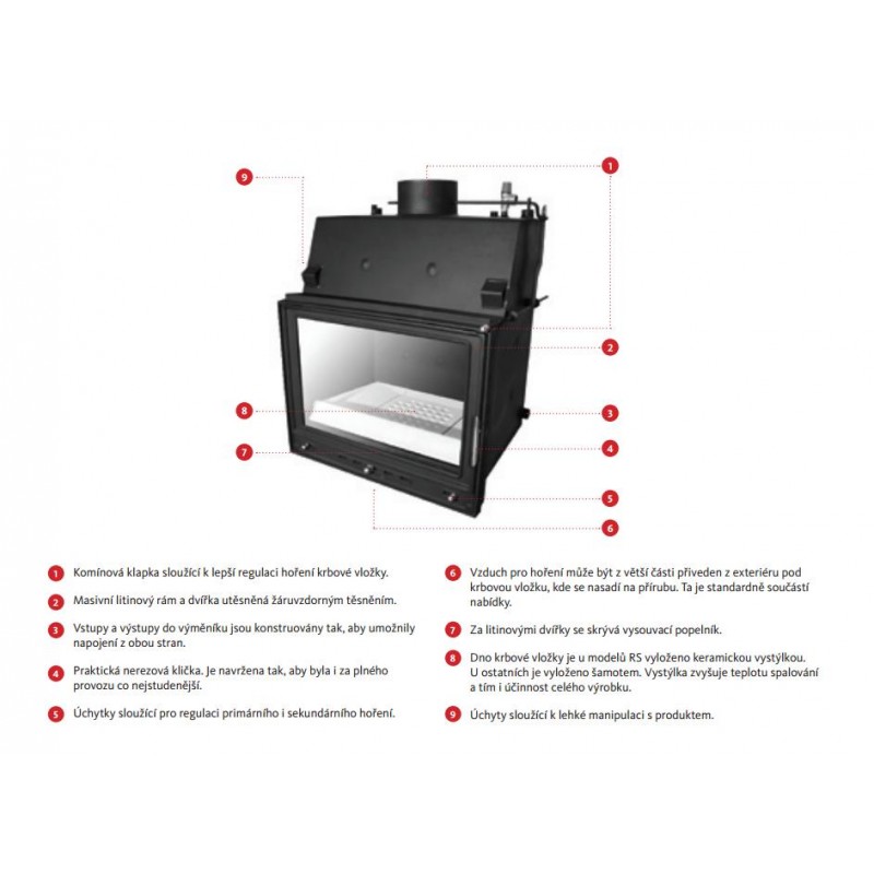 - Dno krbovej vložky je u modelov RS vyložené keramickou výstelkou. U ostatných je vyložený šamotom. Výstelka zvyšuje teplotu spaľovania a tým aj účinnosť celého výrobku