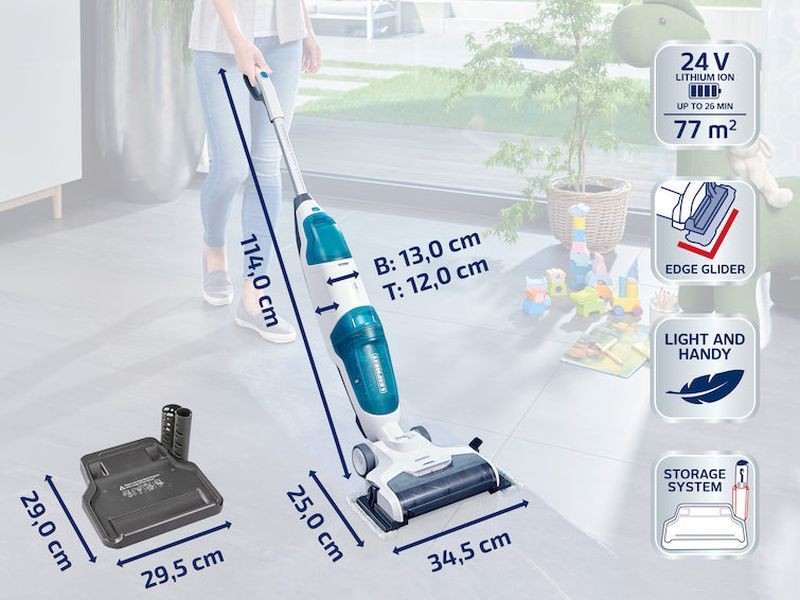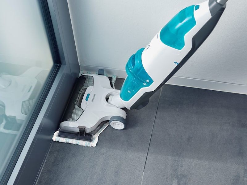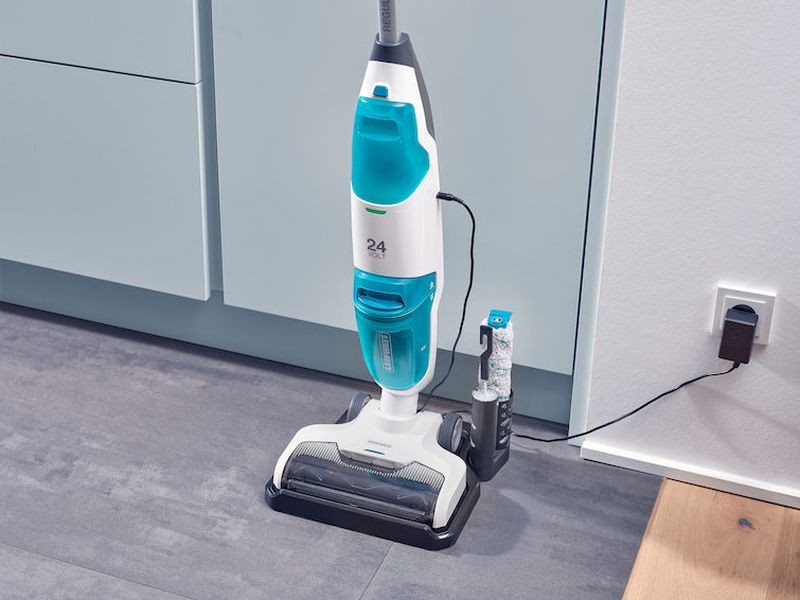 Aku vysávač a mop Regulus Aqua PowerVac Pro značky Leifheit vysáva a vytiera v jednom pracovnom kroku.