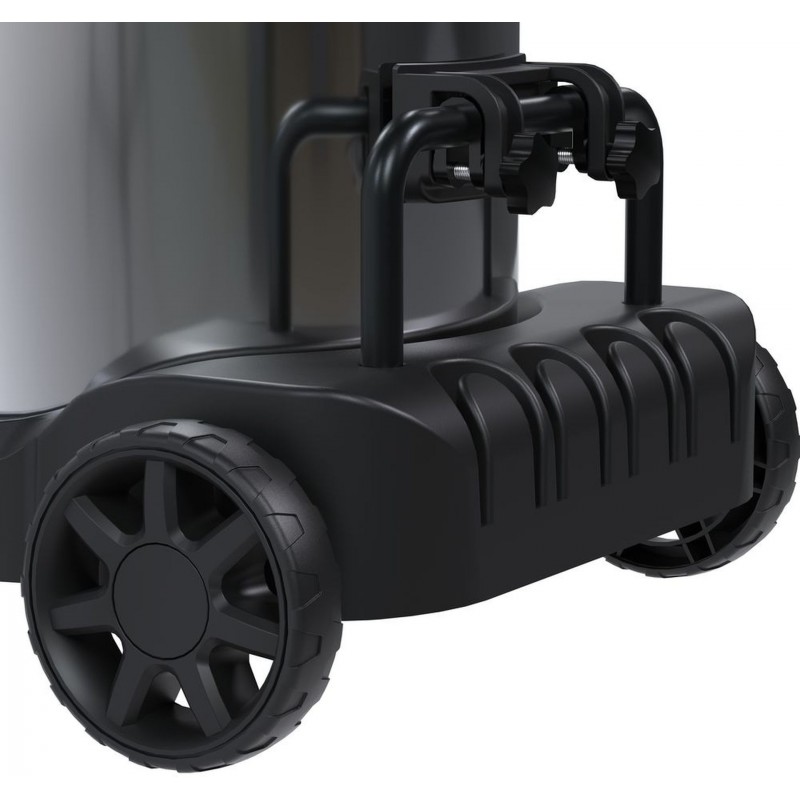 Odolná nerezová nádoba s objemom 60 litrov je ideálna pre dlhšiu prácu bez častého vyprázdňovania. Vysávač disponuje vypúšťacím ventilom na vodu a praktickou funkciou sklopenia nádoby, vďaka čomu je údržba rýchla a pohodlná. Integrovaný systém čistenia filtra udržiava trvalo vysoký sací výkon aj pri intenzívnom používaní.