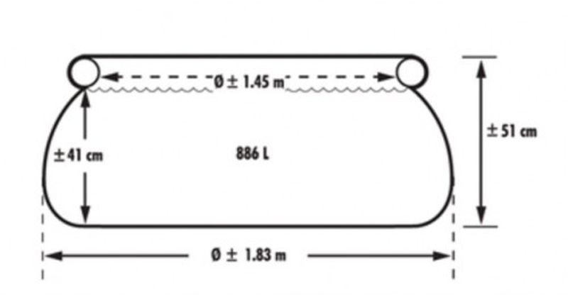 Uvedené rozmery bazéna sú iba orientačné a ovplyvniť ich môže rovnosť podkladu, objem napustenej vody alebo nafúknutie goliera. Povolená výrobná tolerancia je 5%.