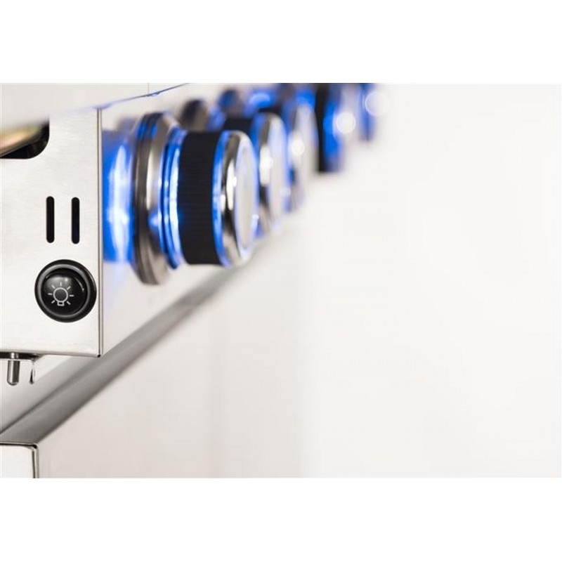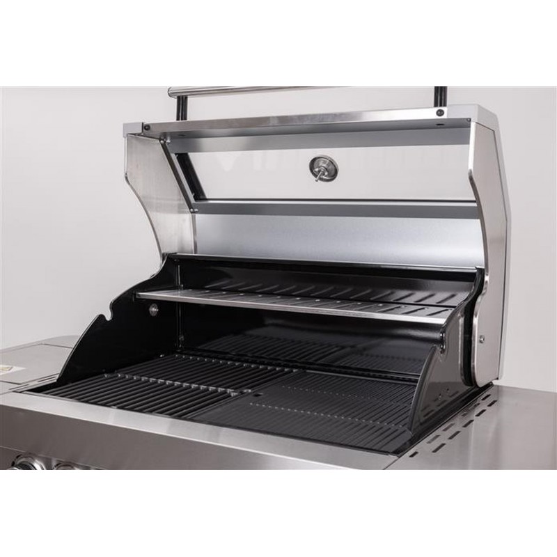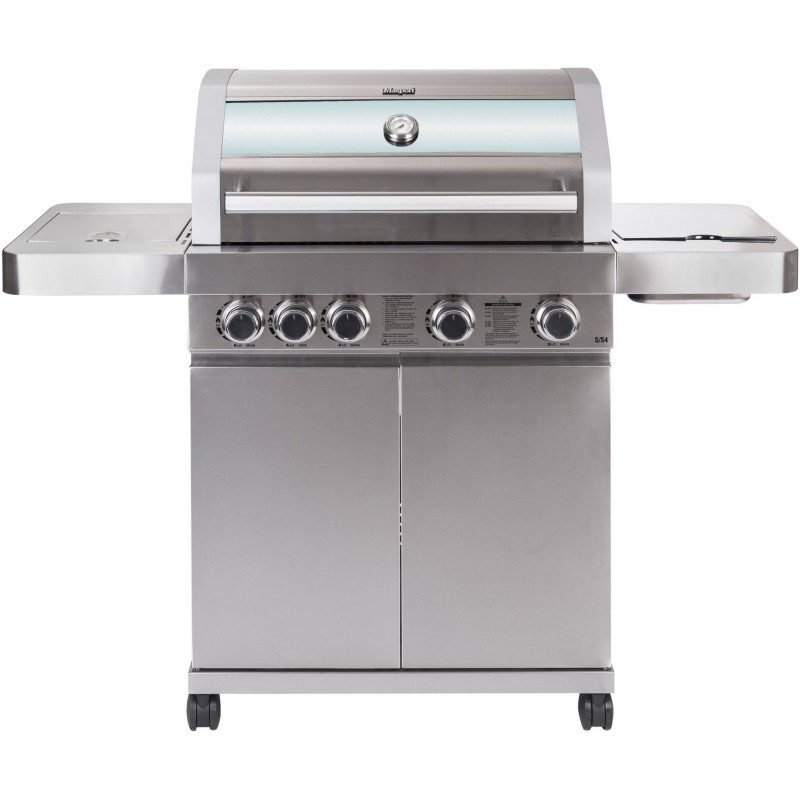 Základom grilu sú 4 vysoko kvalitné plynové horáky z ušľachtilej ocele 304. Integrované zapaľovanie odvádza spoľahlivo svoju prácu. Vďaka poklopu vybavenému teplomerom a skleneným okienkom môžete prípravu vašich pokrmov kedykoľvek kontrolovať. Rošt aj grilovacie tál sú opatrené smaltovanú povrchovou úpravou, ktorá zaručuje veľmi dlhú životnosť. Na ľavej strane grile sa nachádza prídavný horák, vhodný na prípravu omáčok alebo udržanie hotových pokrmov v ideálnej teplote. Na pravej strane potom nájdeme praktické odkladacie miesto. Ako malý, ale napriek tomu praktický detail môžeme uviesť podsvietenia ovládacích prvkov. Plynová fľaša je uzavretá v spodnej skrinke. Transport grilu výrazne uľahčí pojazdové kolieska s možnosťou aretácie. Gril je štandardne dodávaný s UV odolným krycím poťahom.