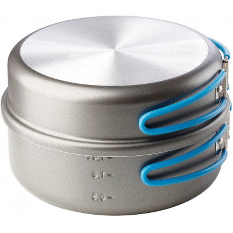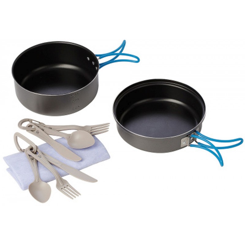 Campingová sada riadu s nepriľnavým povrchom PTFE - vyrobená z pokrytého hliníka. Vonkajší povrch nastriekaný povlakom, ktorý sa dobre obmýva. Na vnútornom povrchu je nanesená tenká PTFE vrstva, ktorá chráni proti pripaľovaniu povrchu a dobre sa čistí. Panva a miska majú sklopné držadlá. Dna panvice a misky sú sústruženie pre lepšiu stabilitu na variči. K sade sa dodáva utierka a dva polypropylénové príbory.