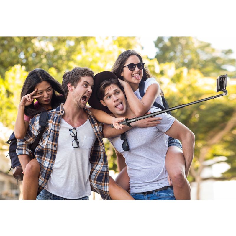 Odnímateľný bezpečnostný gumový pásik pre zvýšenie zabezpečenia vášho smartphonu pred vypadnutím v extrémnych situáciách. Odnímateľnú diaľkovú spúšť je možné v prípade, že ju nebudete používať, z tyče odstrániť. Túto funkciu oceníte vtedy, keď budete chcieť zaobstarať snímku inou rukou alebo použiť statívový stojan, ktorý je možné pripevniť k tejto selfie tyči (statív nie je súčasťou príslušenstva).