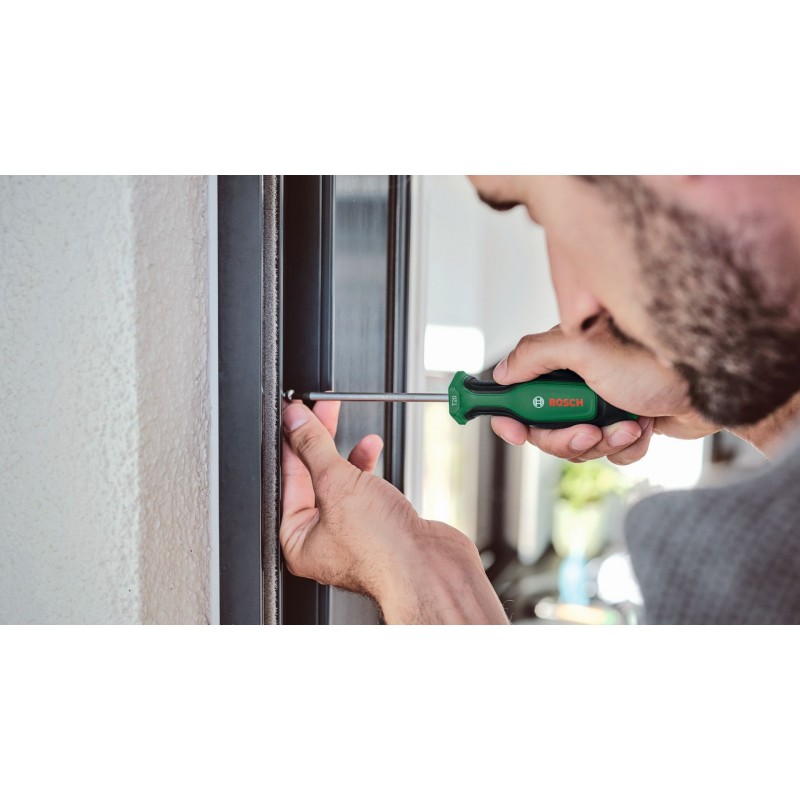 Zvládni akékoľvek upevňovacie práce rýchlo a efektívne s vysokokvalitným skrutkovačom Bosch – vyrobeným s ohľadom na špičkový výkon a vynikajúci komfort. Skrutkovač je vybavený pochrómovaným driekom z extra tvrdej ocele S2, ktorý zaistí mocný uťahovací moment: minimálne o 40 % prekračujúci požiadavky normy (TMD-705). Robustný hrot skrutkovača je s ohľadom na stabilné skrutkovanie magnetický a lepší vizuálny kontrast zaistí čierne fosfátovanie. Dvojzložková rukoväť má mäkkú uchopovaciu plochu na lepšiu manipuláciu a vyšší komfort. Vďaka šesťhrannej prednej časti rukoväti nedochádza k zakotúľaniu. Ktorý skrutkovač Bosch na danú prácu? Výber je jednoduchý a rýchly vďaka farebne rozlíšeným označeniam veľkosti a typu.