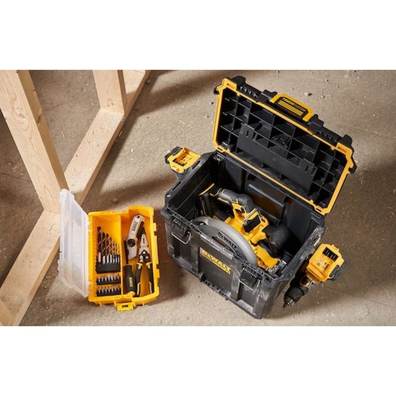 - AUTOMATICKÉ PRIPOJENIE BOČNEJ ZÁPADKY: Umožňuje rýchle a jednoduché pripojenie ku kufríkom na náradie TOUGHSYSTEM 2.0