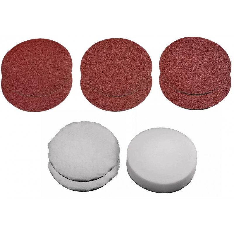 Sada obsahuje po dva kruhové brúsne papiere zrnitosti 60, 80 a 120, ďalej dva syntetické leštiace návleky, penový nadstavec a leštiacu podložku. Umožňuje tak vykonávať široké spektrum leštiacich a brúsnych prác v krátkom čase.
