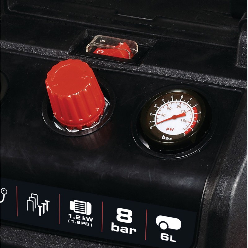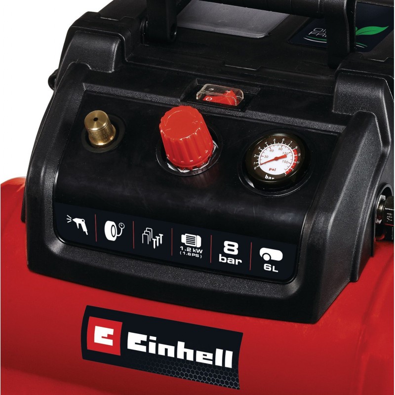 Der Einhell Kompressor TC-AC 190/6/8 OF Set überzeugt mit starken 1,2 kW und einer Ansaugleistung von 190 Litern pro Minute. Mit max. 8 bar Betriebsdruck und einer Pumpendrehzahl von 3.800 Umdrehungen pro Minute, eignet sich der ölfreie Kompressor für verschiedenste Druckluftarbeiten rund um Haus, Werkstatt und Garten. Mit Hilfe der Schnellkupplung können verschiedenste Druckluftwerkzeuge unkompliziert an den kompakten Kompressor angeschlossen werden.