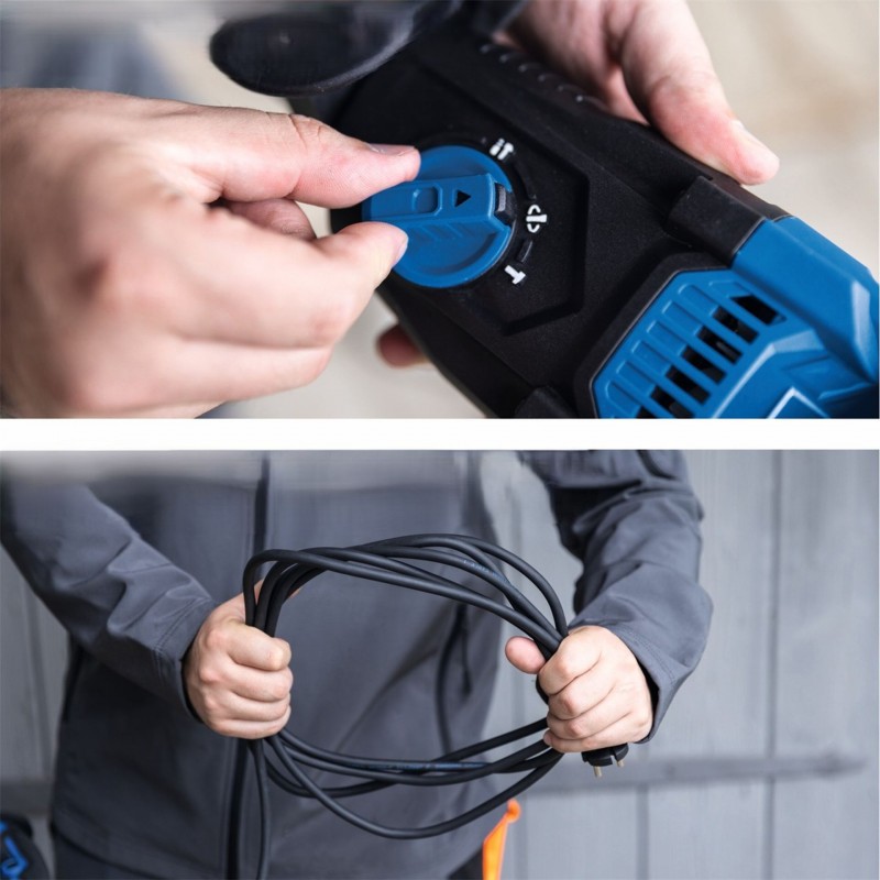 Prepínanie medzi jednotlivými režimami je rýchle a pohodlné vďaka praktickému voliči, bez nutnosti použitia náradia. Pre maximálny komfort a bezpečnosť je kladivo vybavené prídavnou rukoväťou otočnou o 360°, ktorá zabezpečuje pevný a istý úchop v akejkoľvek pracovnej polohe. Ergonomický a kompaktný dizajn s mäkčeným povrchom rukoväte prispieva k pohodlnej manipulácii aj pri dlhšej práci.
