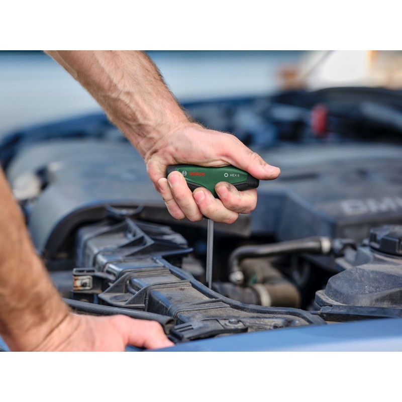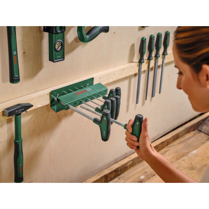 7-dielna súprava imbusových skrutkovačov Bosch s rukoväťou v tvare T poskytne vyšší komfort a flexibilitu pri prácach domácich majstrov. Všetky imbusové skrutkovače s rukoväťou v tvare T (HEX2, HEX3, HEX4, HEX5, HEX6, HEX8, HEX10) sú samostatnou triedou na spoľahlivé a výkonné upevňovanie aj na ťažko dostupných miestach pri montáži nábytku alebo údržbe motocyklov a automobilov. Ergonomické dvojzložkové rukoväti v tvare T s veľkými mäkkými uchopovacími plochami sú stvorené na komfortný a efektívny prenos sily pri skrutkovaní, a to aj pri vysokom uťahovacom momente. Každý skrutkovač s rukoväťou v tvare T má driek z najkvalitnejšej ocele S2 vo svojej triede (56 – 60 HRC). Extra dlhé drieky uľahčia presnú prácu v úzkych a ťažko dostupných miestach. Vďaka intuitívnemu označeniu veľkosti na rukoväti je ľahké vybrať ten správny skrutkovač na akúkoľvek prácu. Prehľadne uložené skrutkovače s rukoväťou v tvare T sa dodávajú v kovovom stojane, ktorý sa dá postaviť, prípadne namontovať na stenu.
