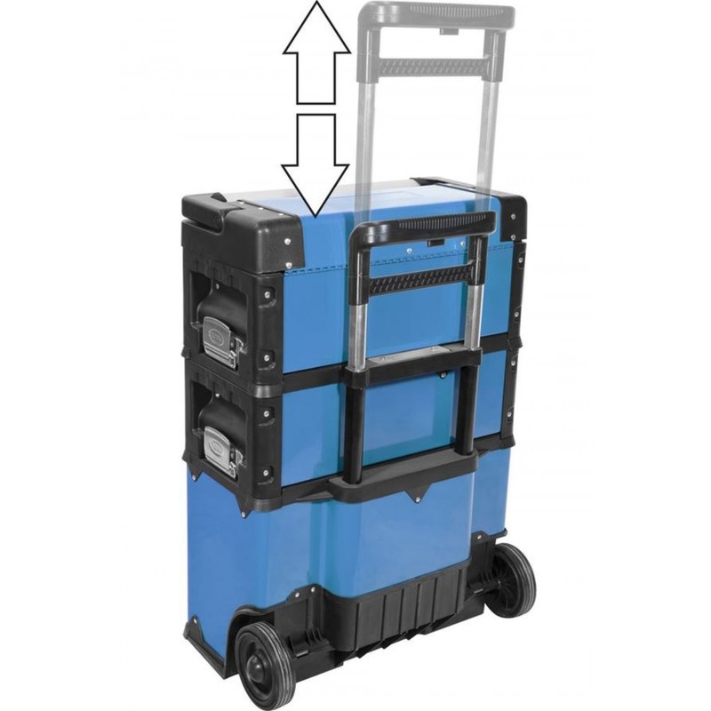 Trojdielny modulárny kufor na náradie. Odoberateľný kufrík na náradie s vložkou na malé súčiastky a náradie. Odoberateľný modul s dvoma zásuvkami (uloženými na guľôčkových ložiskách). Veľký vyklápací kontajner (vrátane vodiacich tyčí). Všetky tri moduly s držadlami na prenášanie, teleskopická rukoväť. Uzamykateľné visiacimi zámkami, konštrukcia z kovu a plastu, stabilné, veľké kolieska z tvrdenej gumy.