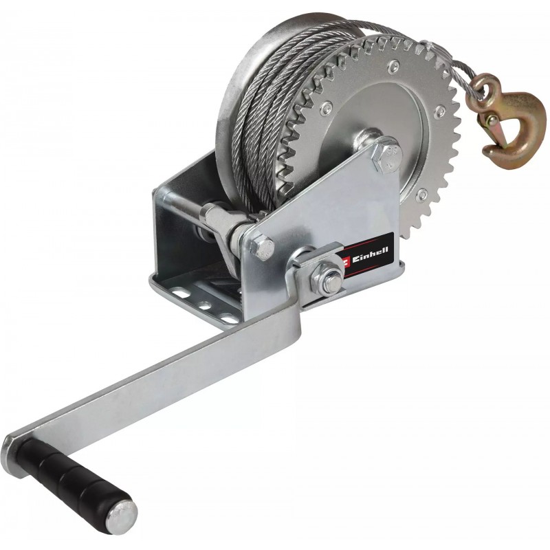 Ruční navijak Einhell TC-WI 800 má maximálnu nosnosť 800 kilogramov. Ručný lanový navijak od Einhellu má 20 metrov dlhé, nekrútené oceľové lano (O 4,8 mm) s bezpečnostným hákom a bezpečnostnou západkou. Bezpečnostná západka zabraňuje nechcenému spusteniu nákladu. Vďaka zarážke proti spätnému chodu je možné lano aj bremeno bezpečne zastaviť. Ručná kľuka je opatrená mäkkou rukoväťou pre bezpečný a pevný úchop a pohodlnú prácu. Upevnenie pomocou montážnej dosky s otvormi je rýchle a jednoduché.