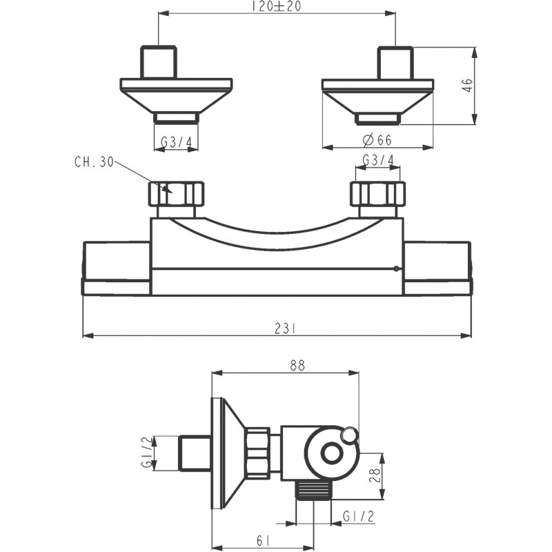 Nástenná sprchová termostatická batéria bez príslušenstva.