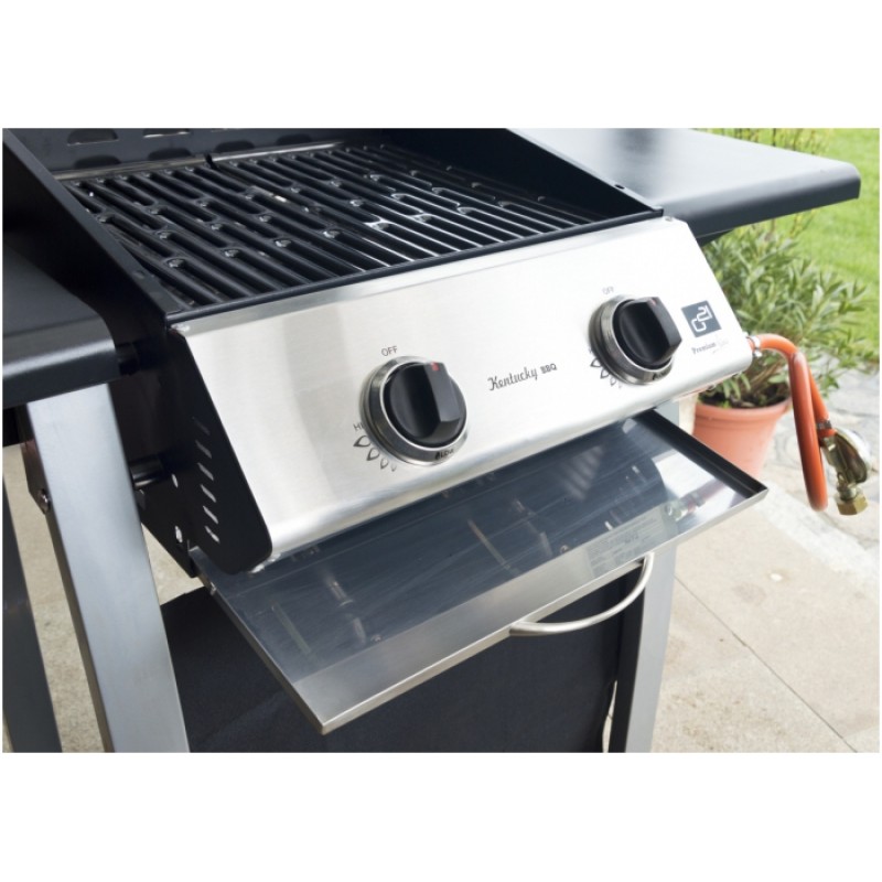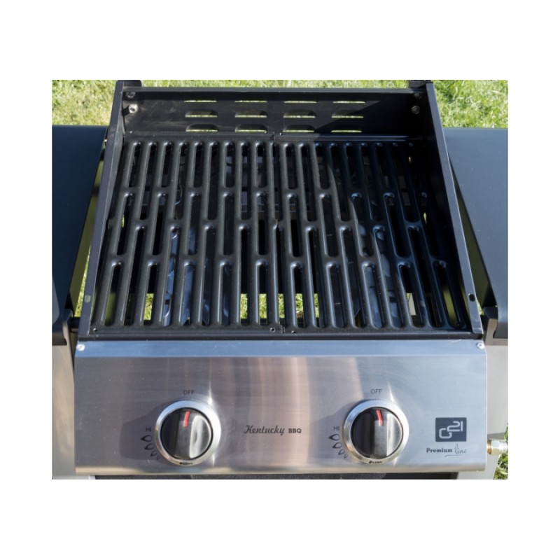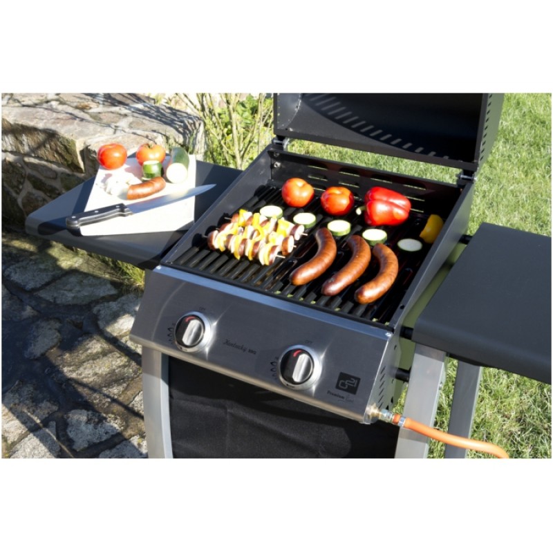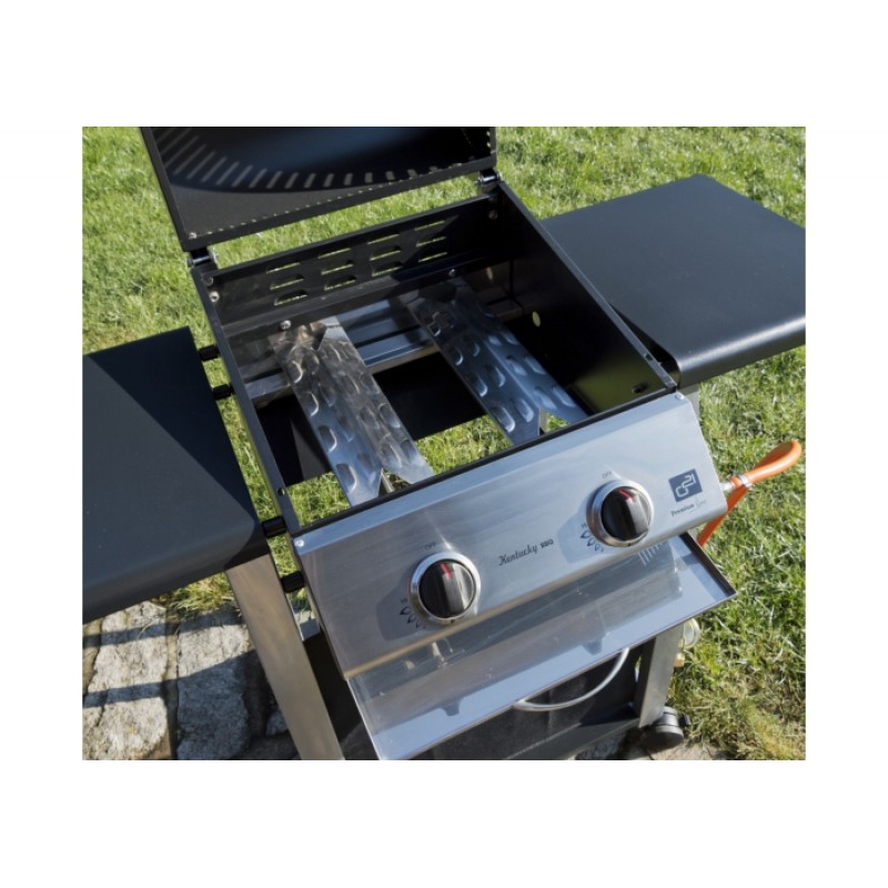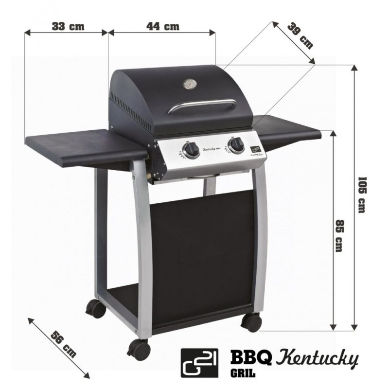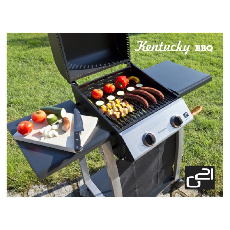 Záhradný plynový gril G21 Kentucky je vybavený systémom Flame Tamer, dvoma hlavnými nerezovými horákmi s piezoelektrickým zapaľovaním a plynovú reguláciou, každý s maximálnym výkonom 3,15 kW. Gril je pojazdný (má 2 kolieska), ďalej je vybavený teplomerom, odklápacím krytom grilovacej plochy a odkladacími drevenými poličkami na oboch stranách.