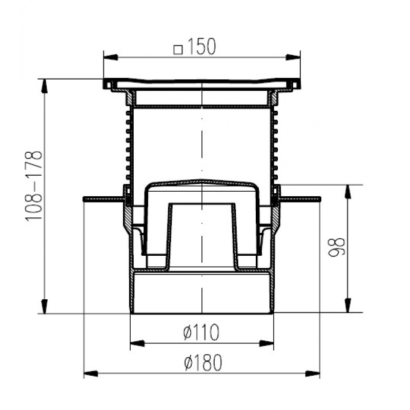 Podlahová vpusť DN 110 (PV110N-PR4) celonerez s prírubou 441Podlahový vpust s vodnou hladinou, je určený pre vnútorné použitie. Golier vpuste možno použiť pre napojenie s hydroizolačnou fóliou alebo stierkou. Príruba slúži na vodotesné spojenie izolacný fólia s podlahovou vpustí. Vyrobené z polypropylénu a nerez ocele DIN 1.4301. Zaťaženia K3 - 300 kg, odolnosť do 90 ° C, norma EN 1253 - 1.