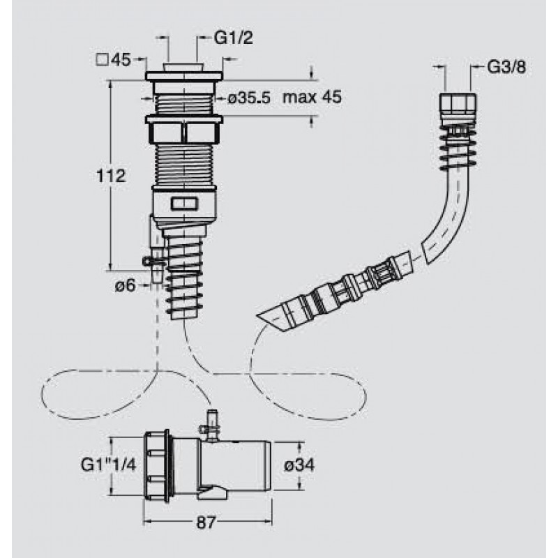FOLLOW ME - systém výsuvu hadice pre montáž na hranu vane. Sprcha sa vratnou pružinou navracia späť a zároveň je hadica osušená. Systém pomocou drenáže zamedzuje zatekaniu vody pod vaňu. V cene je aj prechodový drenážny kus (viď obr) pre zapojenie do odpadu. Systém ANTICALC-zabraňuje usadzovaniu vodného kameňa.
