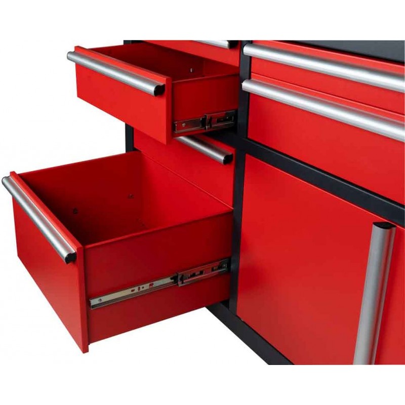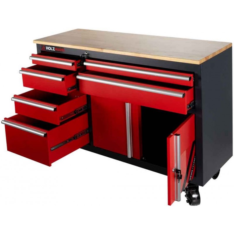 Dielenský vozík je vybavený šiestimi zásuvkami rôznych veľkostí a praktickou skrinkou, čo zabezpečuje prehľadné usporiadanie náradia. Vďaka kolieskam s brzdou je možné vozík jednoducho premiestniť alebo bezpečne zaistiť na mieste. Pracovný stôl je osadený kvalitnou pracovnou doskou z kaučukovníka, ktorá zaručuje dlhú životnosť a odolnosť pri každodennom používaní.