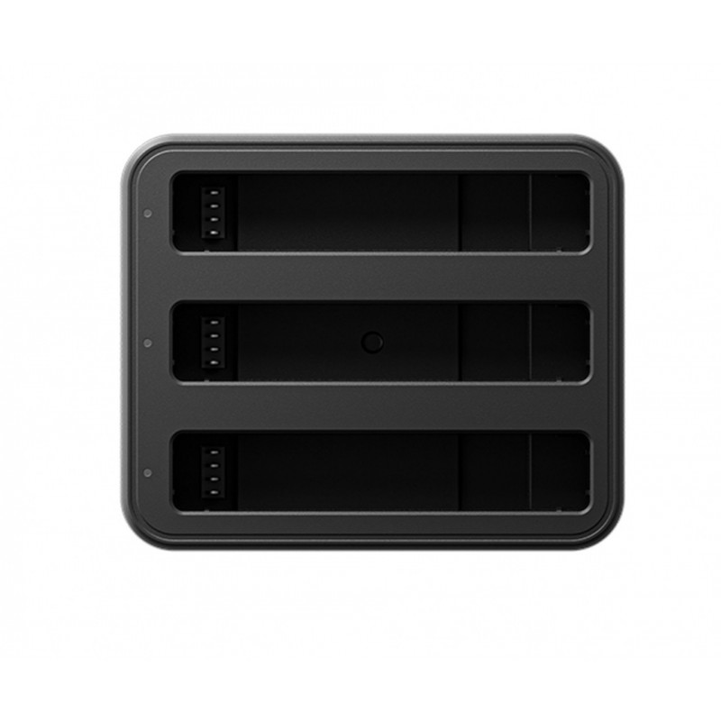 Nabíjací hub pre tri batérie pre kameru Insta360 X4. Hub nabije 2290 mAh akumulátor za 43 minút (na 80 % za 26 minút). Hmotnosť: 109 g Rozmery: 75 x 62 x 34 mm