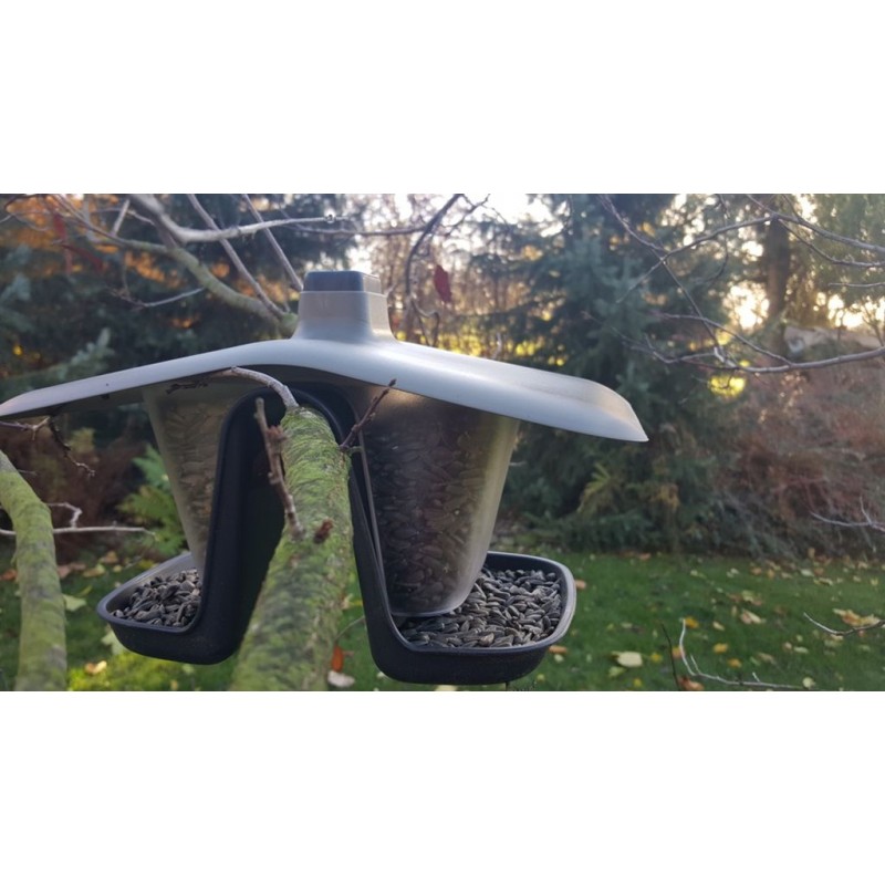 Konštrukcia kŕmidiel vám umožní ich ľubovoľné umiestnenie. Môžete ich zavesiť za nerezové lanko s karabínou (súčasťou balenia), pripevniť k vetve alebo balkonovému zábradlia. Ľahko tak nájdete miesto, ktoré dravcom znemožní útok na vtáčiky. Kŕmidlo s nádobou na rôzne veľké zrno.Kŕmidla vznikla pre tých, ktorí chcú prikrmovať vtáčiky a uľahčiť im prežitie v mrazivom zimnom počasí. Pozorovanie vtáctva v ktoromkoľvek ročnom období je skvelým spôsobom, ako naučiť deti myslieť proekologicky. Vtáky, ktoré takto prilákate na záhradu, vám pozbierajú aj veľa škodlivého hmyzu. Šikmá strieška chráni kŕmenie pred dažďom a snehom. Kŕmidlá majú dekoratívny vzhľad a ich jednoduchá konštrukcia umožňuje jednoduchú údržbu.