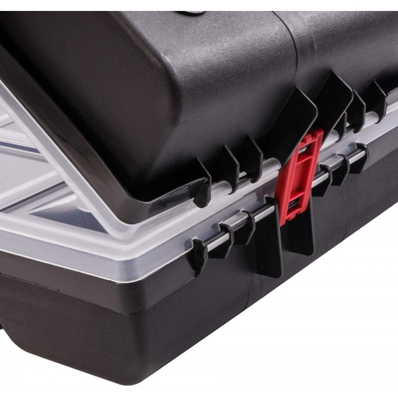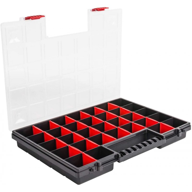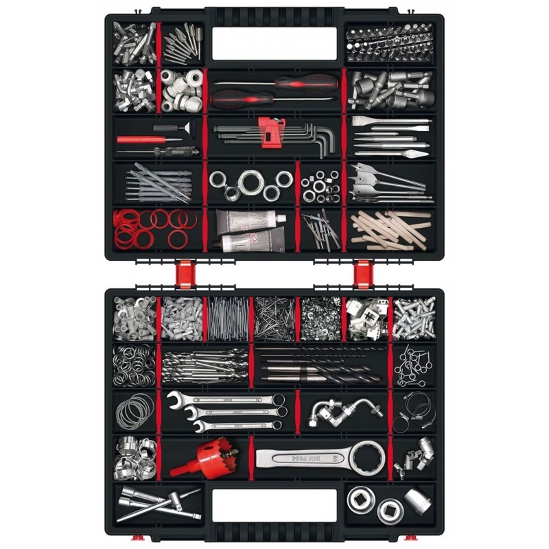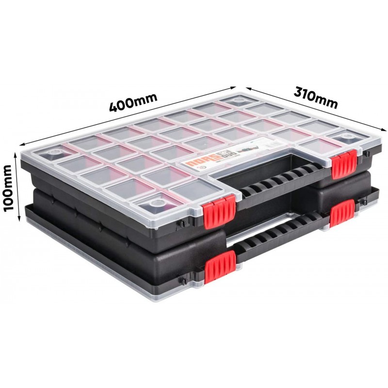 Komplet dvoch organizérov NOR DUO spojených klipsňami. Ponúka možnosť rozpojenie a využívania každého organizéra zvlášť. Kufre otočené vrchnákmi k sebe zaručujú 100% zabezpečenie obsahu. Možnosť regulácie priehradiek umožní prispôsobiť si ich veľkosť a počet aktuálnym potrebám. Organizér je vybavený dvoma zámkami, ergonomickým držadlom a priehľadným vekom, takže jeho obsah je vždy dobre viditeľný.