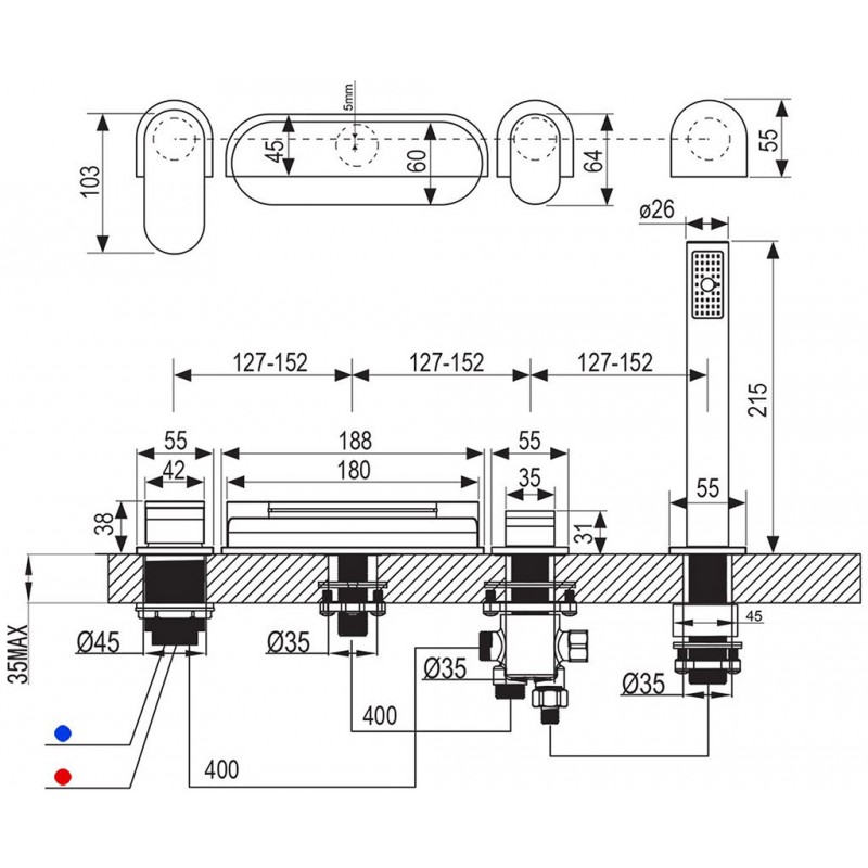 Vaňová stojánková batéria Chrome - vodopád sa inštaluje na vaňu s dostatočnou šírkou a rovnosťou horného lemu - 3, 4 alebo 5tich otvorové.