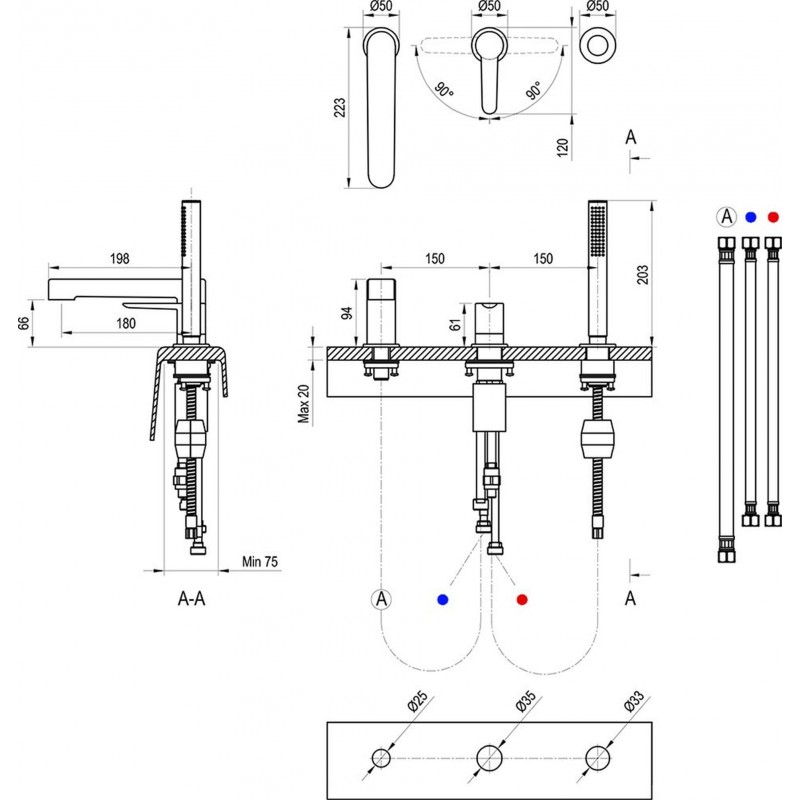 RAVAK PURI PU 026.00 VANOVÁ BATÉRIA NA OKRAJ VANE, TROJOTVOROVÁ X070142