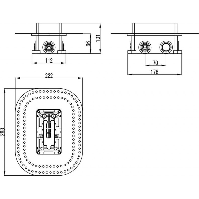 RAVAK RB 071.50 Základné teleso pre podom. batérie X070074 R-box Multi je univerzálny viaccestný inštalačný systém termostatickéj podomietkovéj batérie viaccestnej (CR 067,00), ktorá je zabudovaný v stene. Spodná časť batérie integrovaná do R-boxu. Je vyrobená z kvalitnej mosadze, rovnako tak ako vrchná časť batérie.- Veľmi jednoduchá bezpečná montáž