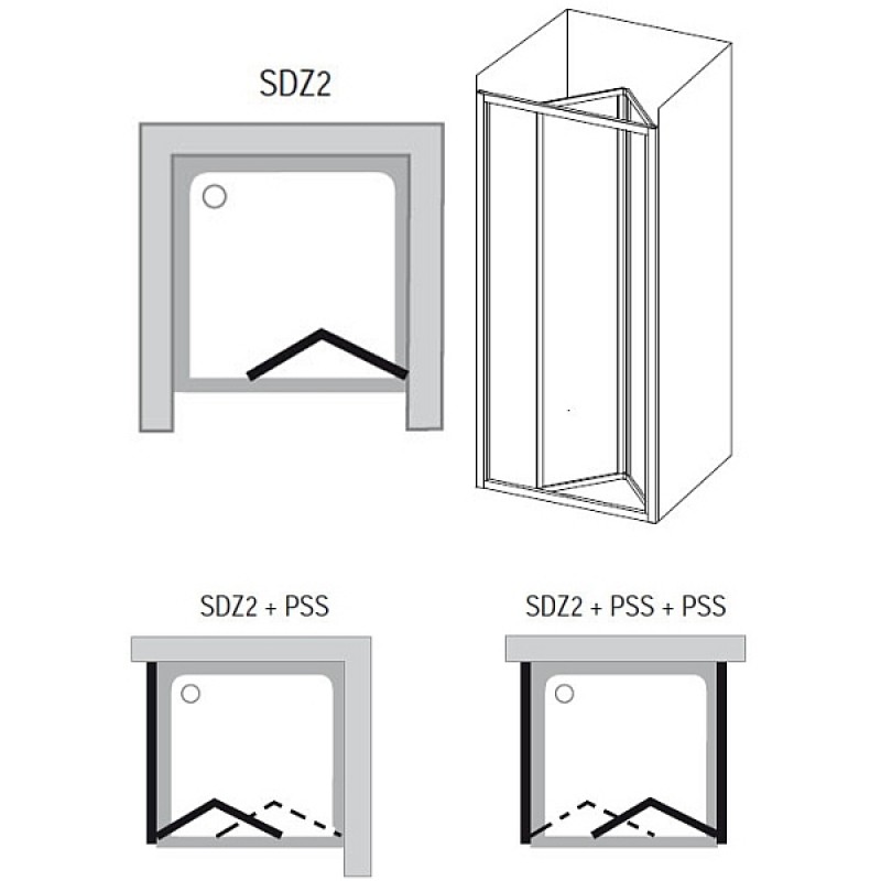 * SDZ2 sa skladajú z dvoch rovnakých dielov spojených zalamovacím kĺbom. To umožňuje maximálnu možnú šírku vstupu a používa sa preto pre najmenších sprchovací priestory so šírkou 67-71 cm.