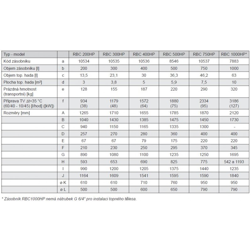 Zásobníkový ohrievač teplej vody pre domácnosť RBC HP (ďalej len zásobník) s jedným zväčšeným smaltovaným hadom s pripojením G 5/4 "(zásobníky s objemom 750 a 1000 litrov majú pripojenie G 6/4"). Zásobníky majú možnosť (s výnimkou zásobníku s objemom 1000l) inštalácia elektrického vykurovacieho telesa do návarku G 6/4 ". Zásobníky so zväčšeným vykurovacím hadom sú vhodné najmä pre ohrev tepelným čerpadlom. Pre správnu funkciu zásobníka je nutné optimálne navrhnúť celú hydrauliku vykurovacieho systému, tzn. umiestnenie obehových čerpadiel zdrojov a vykurovacích okruhov, ventily, spätné klapky a pod.