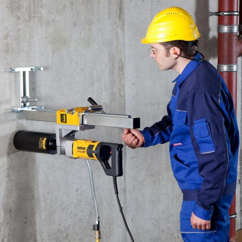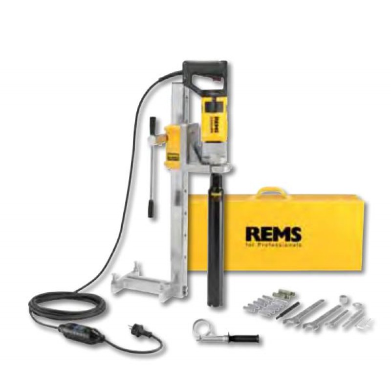 Elektrická diamantová jadrová vŕtačka pre jadrová vŕtanie do železobetónu do priemeru 102 (132) mm, muriva do priemeru 162 mm. K vŕtaniu na sucho alebo s výplachom, vedené ručne alebo s vŕtacím stojanom. Pohonný stroj s vonkajším pripojovacím závitom UNC 11/4 "vonkajším, G 1/2" vnútorným pre vŕtacie korunky, prevody netreba údržbu, s bezpečnostnou klznou trecou spojkou, univerzálnym motorom 230 V, 50 - 60 Hz, 1800 W. Viacúčelová elektronika s pozvoľným rozbehom, obmedzením voľnobežných otáčok, poistkou proti preťaženiu, ochranou proti zablokovaniu. Dotykový spínač s aretáciou. Osobný ochranný spínač (PRCD). Otáčky vŕtacieho vretena pri zaťažení 580 1/min. Zariadenie na prívod vody s nastaviteľným uzatváracím ventilom a rýchlospojkou s možnou blokáciou prietoku vody a hadicovou prípojkou 1/2 ". Protismerný držiak. Navrtávacia pomôcka G 1/2" s vrtákom priemer 8 mm, šesťhranný nástrčný kľúč SW 3. Jednostranný kľúč SW 32. V pevnom kufri z oceľového plechu. Vŕtacie stojan REMS Simplex 2 vrátane upevňovacej sady pre murivo a betón. Bez diamantových jadrových vŕtacích koruniek