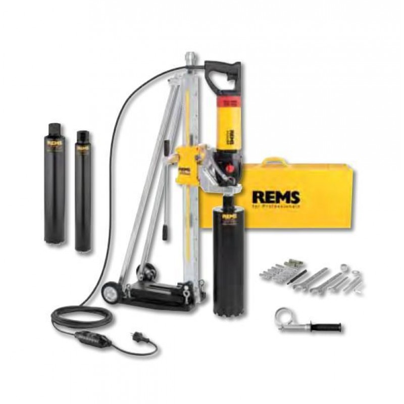Elektrická diamantová jadrová vŕtačka s reguláciou rýchlosti. Pre jadrová vŕtanie do železobetónu do priemer 162 (200) mm, muriva do priemer 250 mm. K vŕtanie ako nasucho tak is výplachom, vedené ručne alebo s vŕtacím stojanom. Pohonný stroj s vonkajším pripojovacím závitom UNC 11/4 "pre vŕtaciu korunku, vo vnútri G 1/2", 2-stupňovou prevodovkou nevyžadujúci údržbu, s bezpečnostnou klznou trecou spojkou, univerzálnym motorom 230 V, 50 - 60 Hz, 2200 W. Plynulá elektronická regulácia otáčok 200 1/min až 500 1/min (1. rýchlosť) resp. 500 1/min až 1200 1/min (2. rýchlosť), ochrana proti prehriatiu. Viacúčelová elektronika s pozvoľným rozbehom, obmedzením voľnobežných otáčok, poistkou proti preťaženiu, ochranou proti zablokovaniu. Dotykový spínač s aretáciou. Osobný ochranný spínač (PRCD). Zariadenie na prívod vody s nastaviteľným uzatváracím ventilom a rýchlospojkou s možnou blokáciou prietoku vody a hadicovou prípojkou 1/2 ". Protismerný držiak. Jednostranný kľúč SW 32. V pevnom kufri z oceľového plechu. Vŕtací stojan REMS Titan vrátane upevňovacej sady pre murivo a betón. Bez diamantových jadrových vŕtacích koruniek.