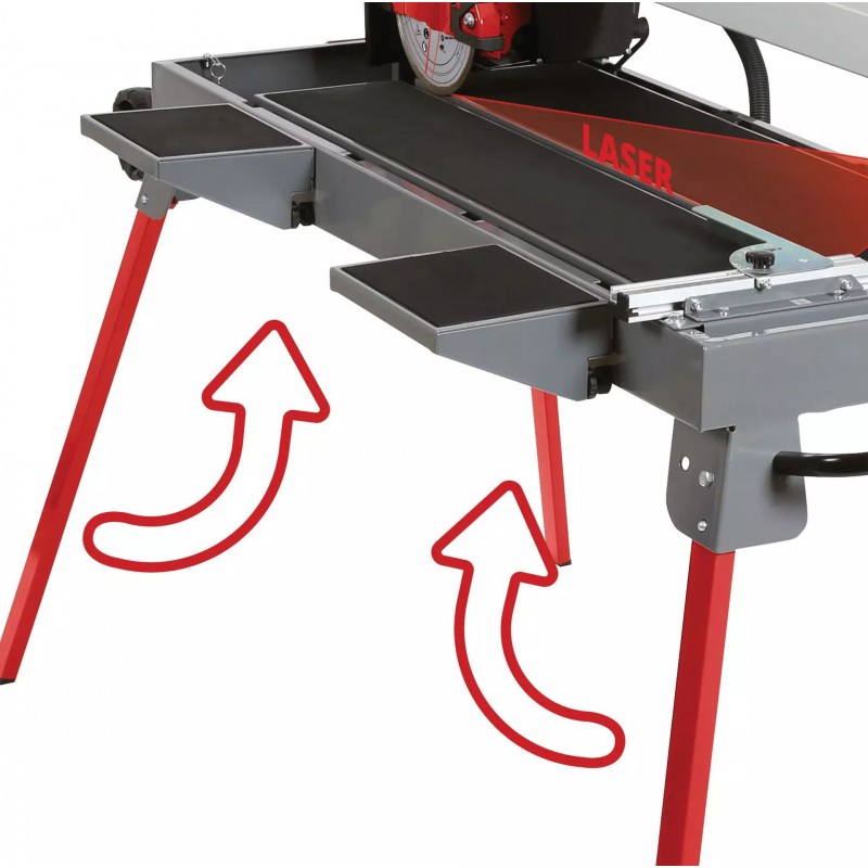 Rezačka dlaždíc stojí na robustnom sklápacom podstavci s funkciou zaklapnutia. Výškovo nastaviteľná noha umožňuje nastaviť pohodlnú pracovnú výšku. Veľký pracovný stôl s protišmykovou gumovou úpravou ponúka dostatočnú pracovnú plochu pre menšie projekty. Pre spracovanie väčších plôch sú ako rozšírenie pracovného stola k dispozícii dva dodatočné pracovné stolíky. Robustné prepravné kolieska a prepravná rukoväť umožňujú jednoduché presúvanie rezačky.