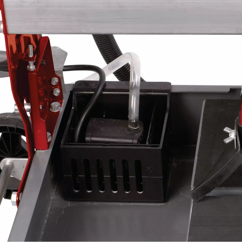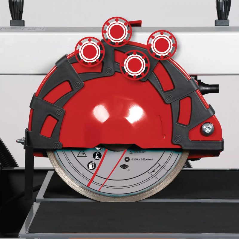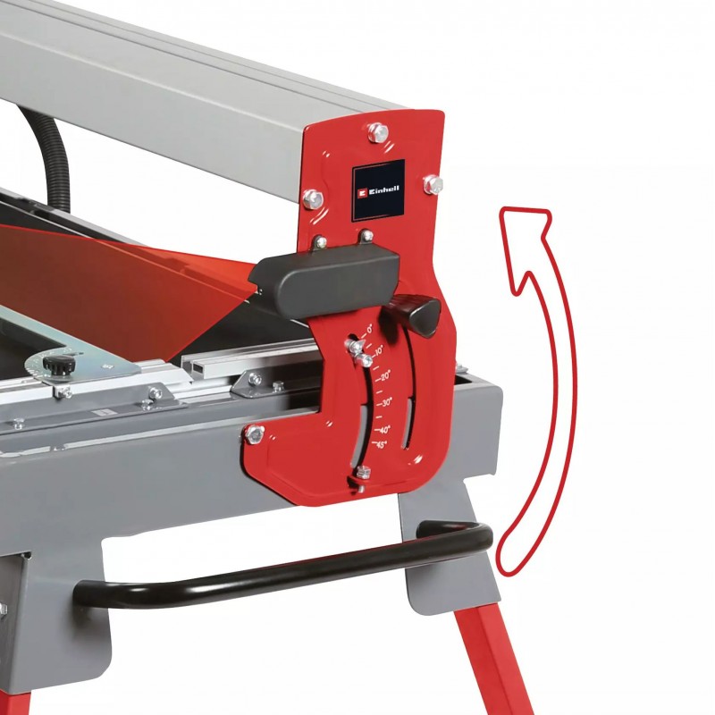 Rádiálna rezačka dlaždíc od firmy Einhell disponuje extra dlhými reznými dĺžkami pre moderné veľkoformátové dlaždice. Ako optická pomôcka pri rezaní slúži laser. Posuv motora vybavený šiestimi guličkovými ložiskami poskytuje rovnomerný rez. Presné vedenie rezu zaisťuje uhlovo presne nastaviteľný uhlový doraz, ktorý slúži ako pevné vedenie pre pokosové aj dvojité pokosové rezy. Motor je výkyvný až do 45° a je už vybavený turbo-diamantovým rezacím kotúčom s prívodom vody. Vodné čerpadlo s klietkou zachytávajúcou nečistoty a umývateľnými filtračnými rohožami chráni čerpadlo pred vniknutím väčších odštiepkov a pevných nečistôt. Okrem toho sa prostredníctvom integrovanej filtrácie zachytávajú jemné kovové častice, takže čerpadlo je chránené aj pred nimi. Masívna vaňa na zachytávanie vody je vyrobená z oceľového plechu.