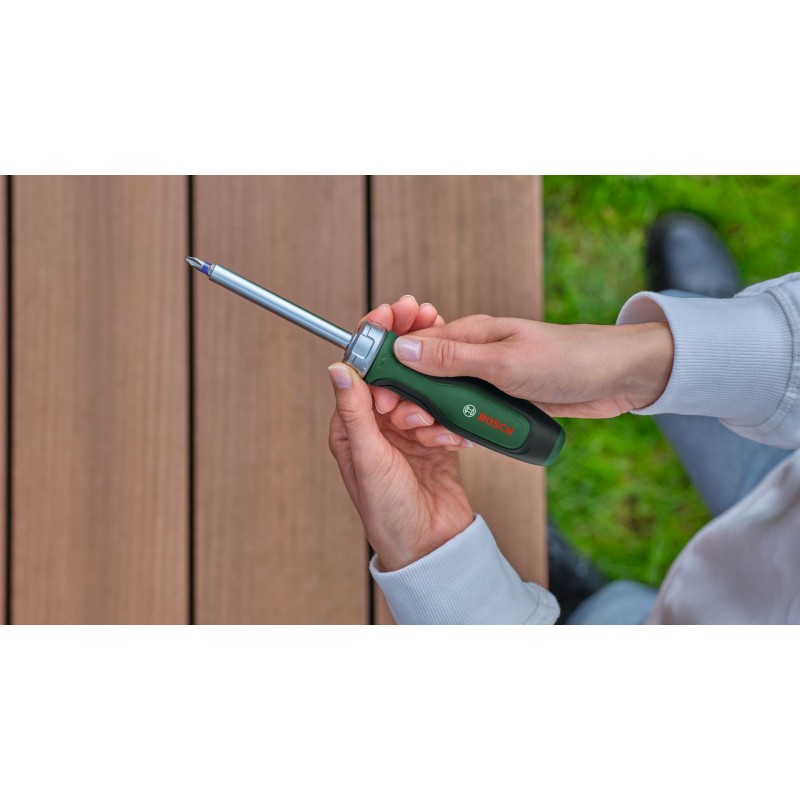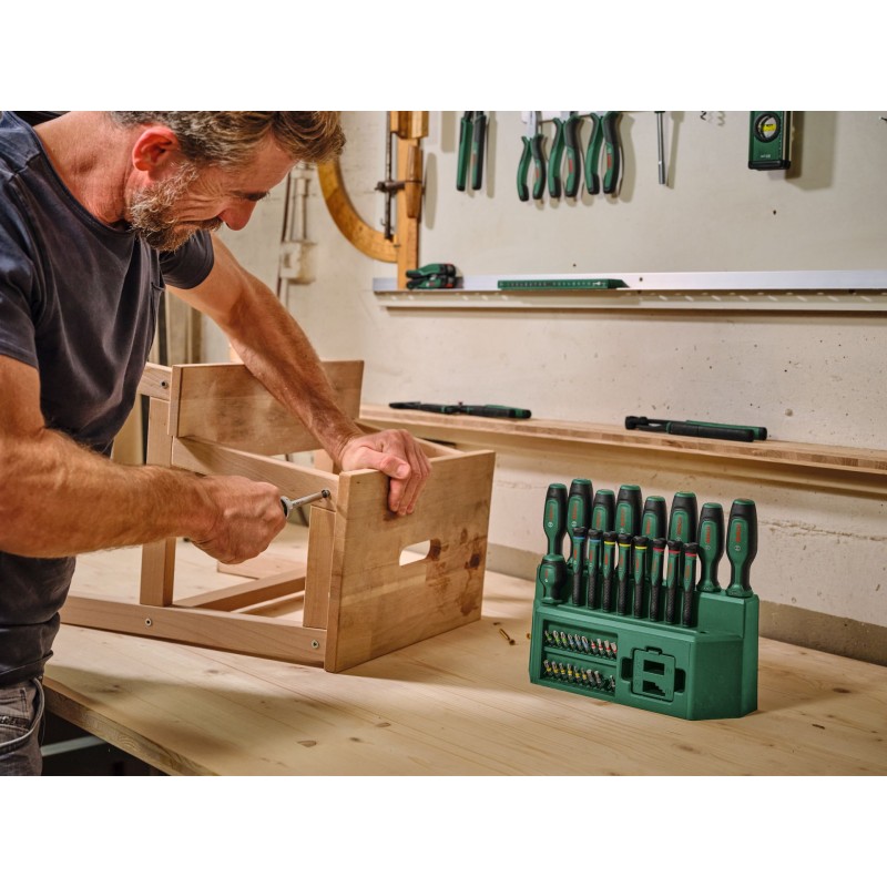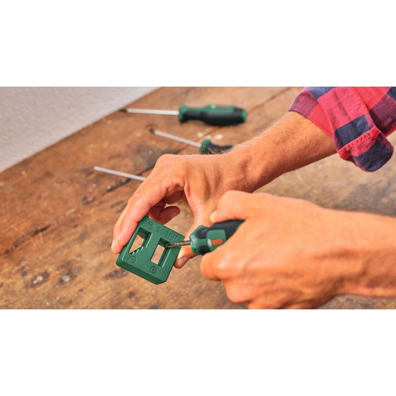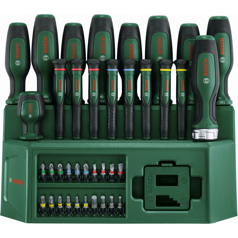 Dokončite akúkoľvek upevňovaciu úlohu rýchlo a efektívne s vysokokvalitnou zmiešanou 39-dielnou súpravou skrutkovačov Bosch. Súprava obsahuje širokú škálu rôznych skrutkovačov: 8 bežných skrutkovačov (PH1/2, PZ1/2, SL4/6,5, TX20/25), 8 precíznych skrutkovačov (SL1,5/2,5/3, PH00/PH0, TX5/6/8), račňový skrutkovač na bity, krátky skrutkovač na bity a 20 bitov (PH1/2/3, PZ1/2/3, SL3/4/5/6, TX10/15/20/25/30,40, HEX3/4/5/6). Všetky skrutkovače sú vyrobené z odolných materiálov. Majú dvojzložkové mäkké rukoväti na maximálny komfort. Vďaka farebne rozlíšeným typovým označeniam je možné skrutkovače a bity vybrať ľahšie a rýchlejšie. Súprava obsahuje aj magnetizér na jednoduchú magnetizáciu a demagnetizáciu skrutkovačov a bitov. Dodáva sa v praktickom stojane, ktorý je možné umiestniť na pracovný stôl a umožní prehľadné skladovanie a ľahký prístup.