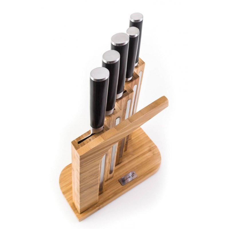 Neviete kam nože bezpečne uložiť? Do stojanu! Súčasťou sady je dizajnový stojan, vyrobený z ekologického bambusového dreva. V stojane má každý z nožov svoje bezpečné miesto.