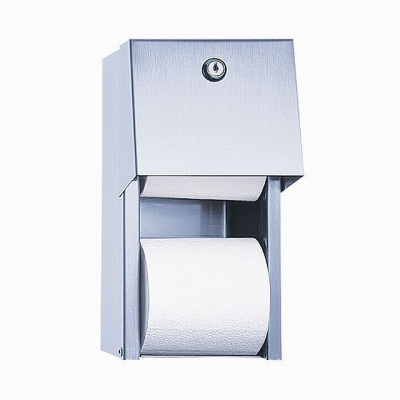 SLZN 26 - obj.č. 95260 - nerezový držiak toaletných rolí, montáž na stenu, pre dve bežné WC papierové rolky (pr. do 135 mm), po spotrebovaní je prvá rola automaticky nahradená druhou, zámok s kľúčom, povrch matný
