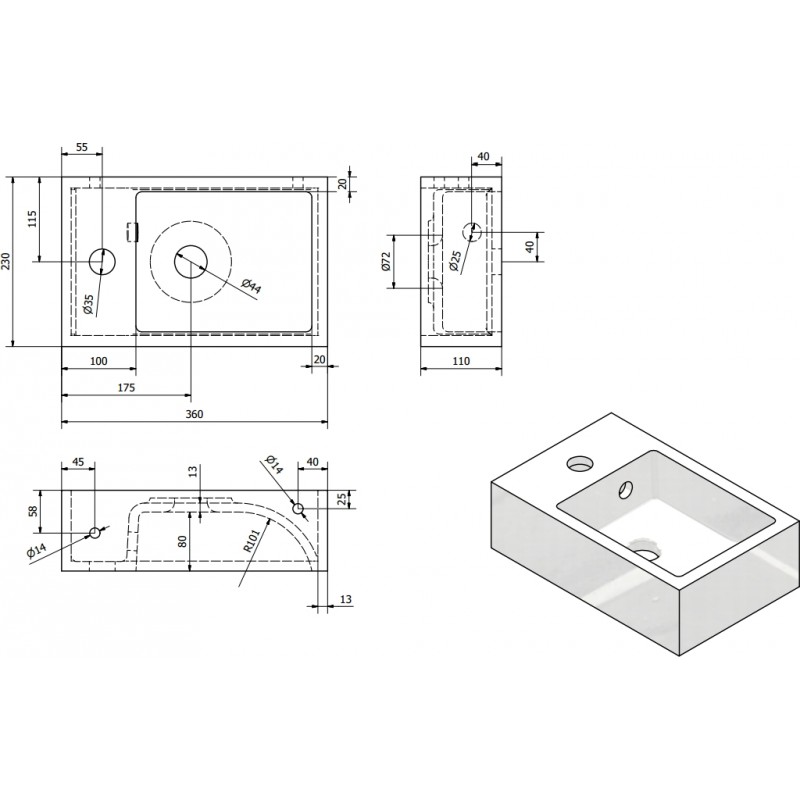ALABAMA Umývátko z liateho mramoru, otvor pre batériu vľavoRozmery: 36x11x23cm