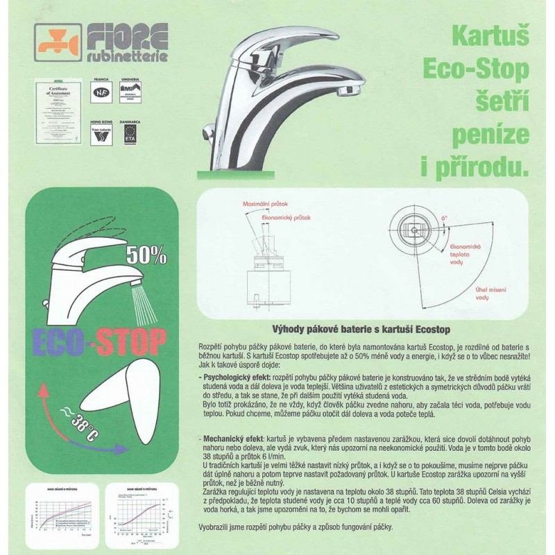 Rozpätie pohybu páčky pákové batérie s kartušou ECO-STOP je konštruované tak, že v strednom bode vyteká iba studená voda a ďalej doľava je voda teplejšia. Kartuša je vybavená vopred nastavenú zarážkou, ktorá síce dovolí dotiahnuť pohyb nahor alebo doľava, ale vydá zvuk, ktorý nás upozorní na neekonomické použitie. Voda má v tomto bode teplotu okolo 38 stupňov a prietok je 6l/min.