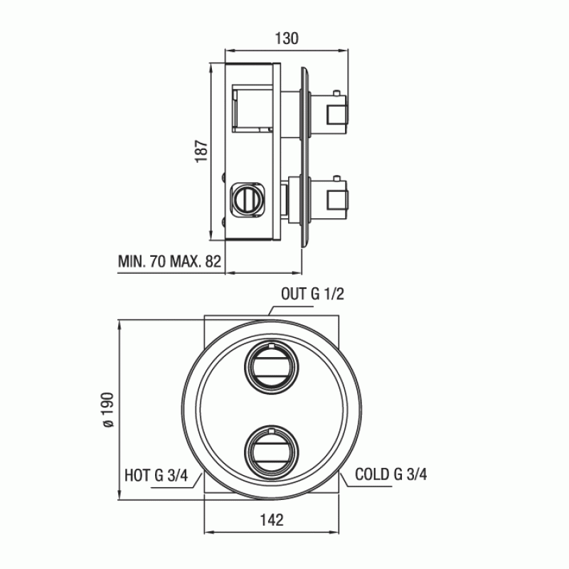 Podomietková termostatická sprchová batéria pre 2 výstupy.