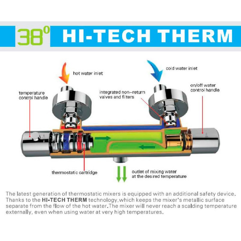 termostatické batérie poslednej generácie majú dvojitú ochranu. Aj keď do batérie potečie teplá voda, tak sa batérie na povrchu neohrieva. To všetko vďaka systému HI-TECHTERM, ktorý oddeľuje horúcu vodu od povrchu termostatické batérie.