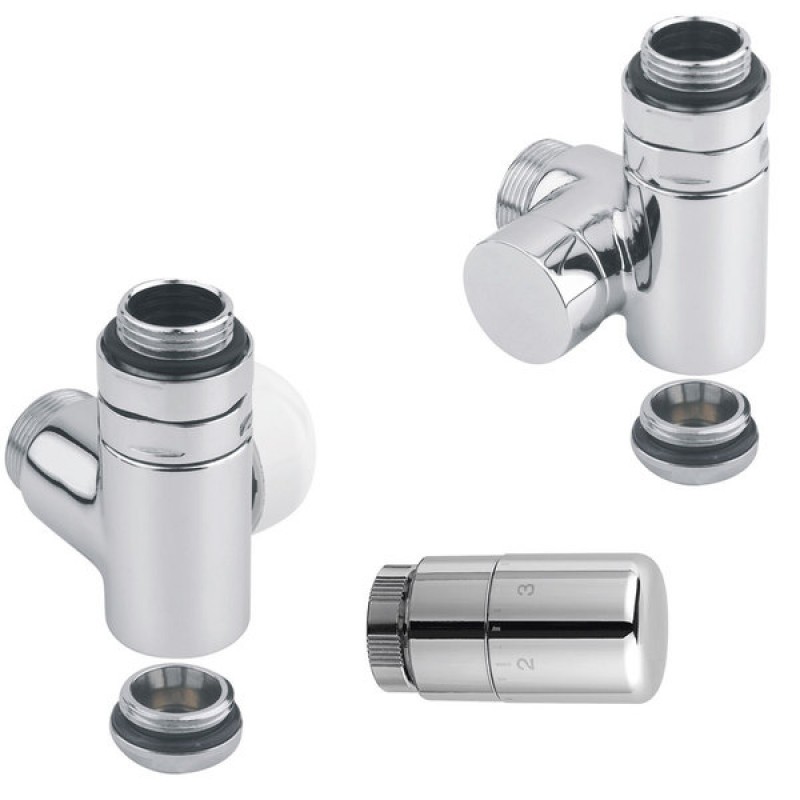 Dizajnová sada ventilov s termostatickou hlavicou vhodná pre pripojenie vykurovacích telies, kde zákazník predpokladá kombináciu s elektrickým vykurovacím telesom s vnútorným závitom G1 / 2 ".