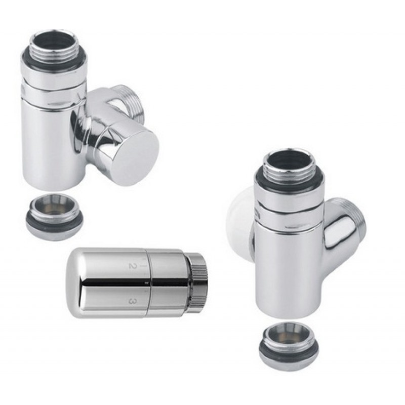 Dizajnová sada ventilov s termostatickou hlavicou vhodná pre pripojenie vykurovacích telies, kde zákazník predpokladá kombináciu s elektrickým vykurovacím telesom s vnútorným závitom G1 / 2 ".