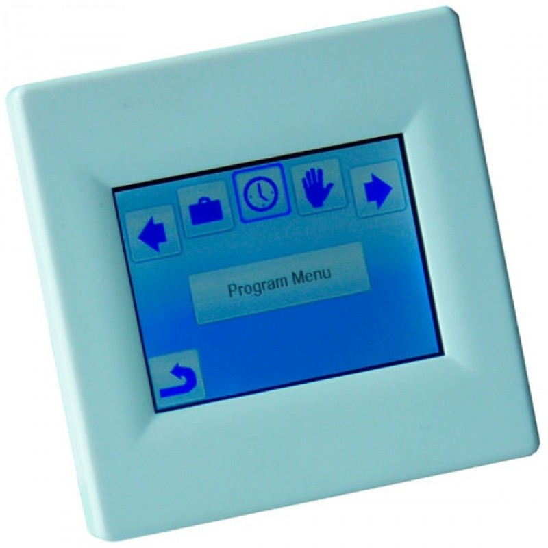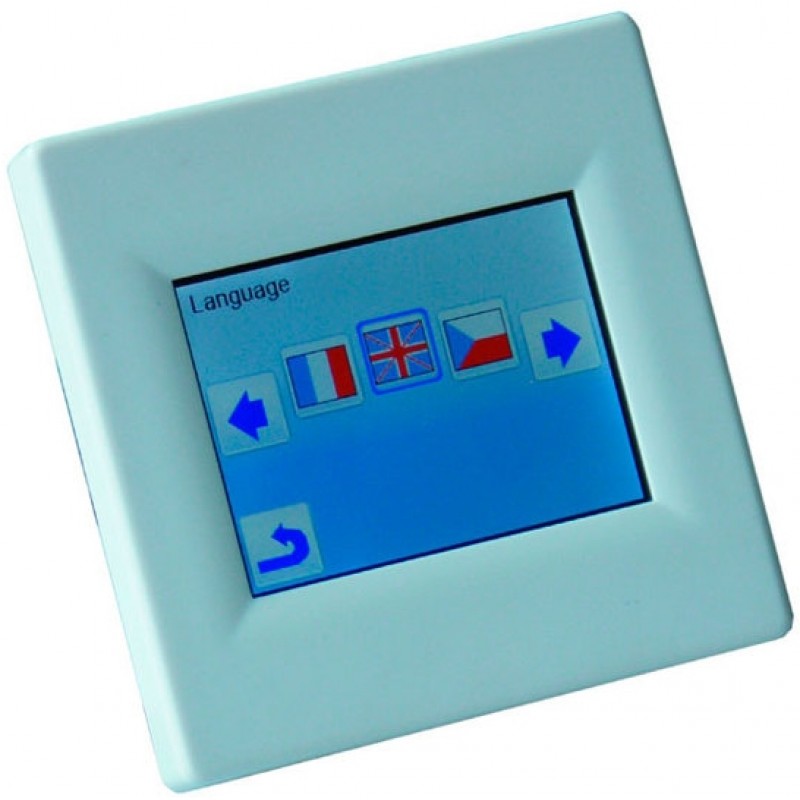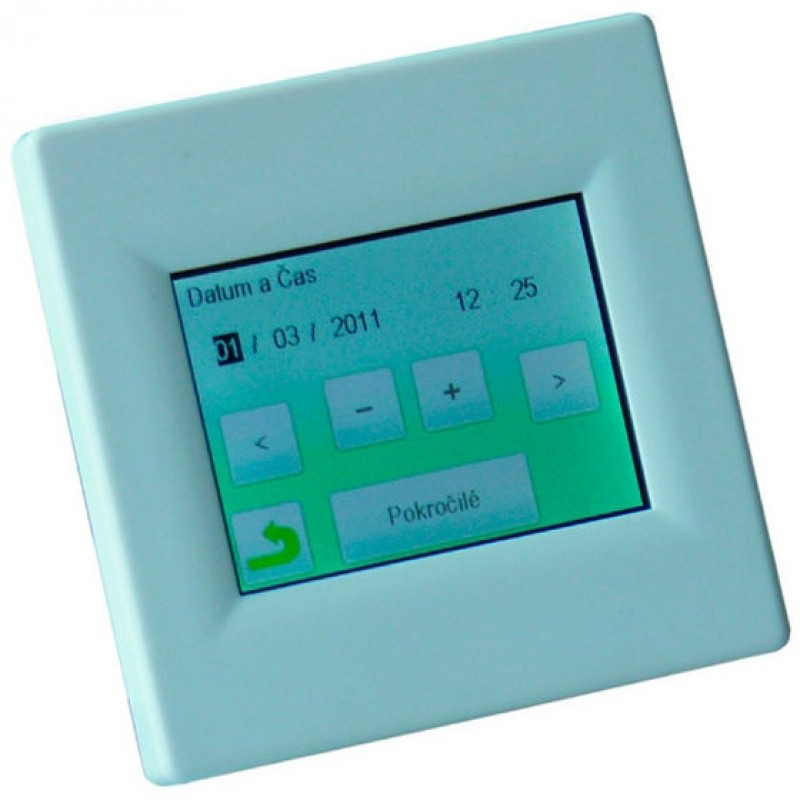 Dotykový ( uzamykateľný ) displej s voliteľnou farbou pozadia , CZ menu , voľba meraných teplôt : " podlaha / priestor / podlaha + prostor/2x podlaha + priestor " ; nastaviteľný typ regulácie : pevná teplotná diferencia alebo PWM ( pulzná šírková modulácia ) ; počítanie prevádzkových nákladov ( deň / mesiac / rok ) ; zobrazenie teploty priestoru aj podlahy .