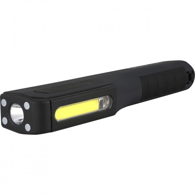 Praktická a kompaktná svietidlo do ruky, ktorá v prednej častí disponuje 3W COB a 1W LED. Zároveň na druhej strane má 5 červených LED diód, ktoré slúžia ako výstražné svetlo. Zaujímavým doplnkom je magnet na prednej strane.