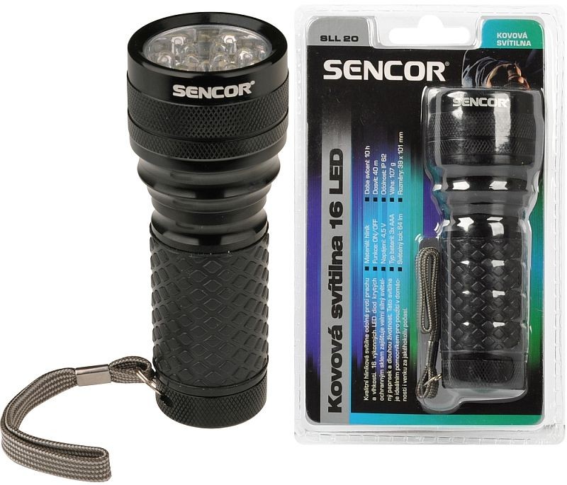 SENCOR SLL 20 Svietidlo ALU 16LED 3xAAAKvalitná hliníková svietidlo odolná prachu a vlhkosti. 16 výkonných LED diód krytých ochranným sklom zaisťuje veľmi silný svetelný lúč a dlhú životnosť. Toto svietidlo je ideálnym pomocníkom pre použitie v domácnosti aj vonku za akéhokoľvek počasia.