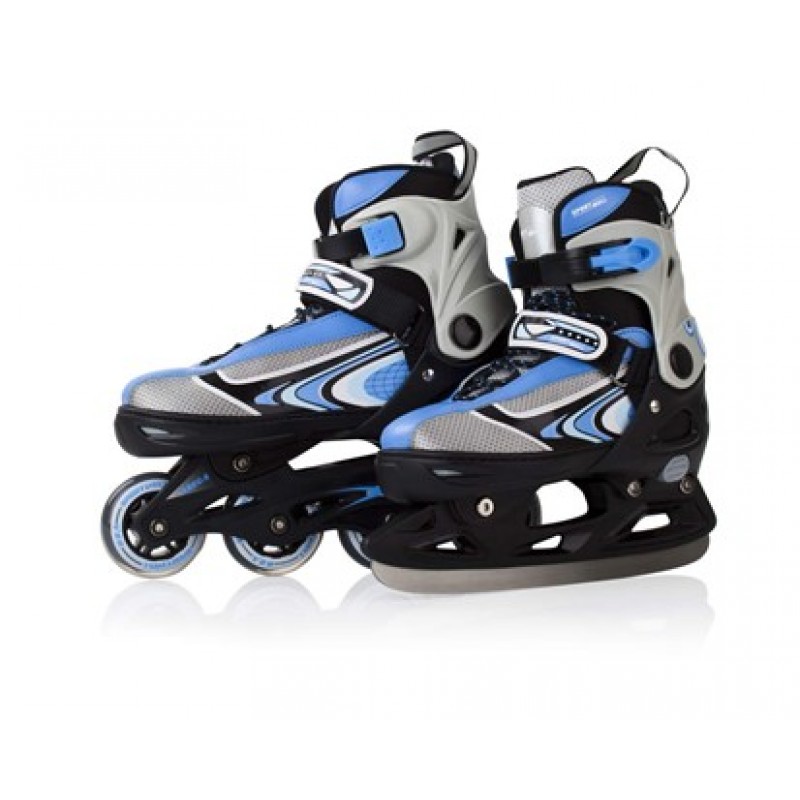 SPORTWELL korčule, nastaviteľná veľkosť XS (29-32), ABEC-5, modré 51PW223BBLUEXSĽadový korčule SPORTWELL, nastaviteľná veľkosť XS 29-32, vymeniteľné in-line šasi - kolieska ABEC-5, modré. Univerzálne nastaviteľné korčule 2 v 1 ľadový - in-line - 3 dielny pružný skelet - soft vložka - obojstranná pracka - šnurovanie spevnené sťahujúcim pásikom cez priehlavok na suchý zips - kvalitný hokejový nôž z nerezovej ocele. Súčasťou tohto kompletu je vymeniteľný podvozok na in-line korčule - ložiská ABEC5, kolieska PU, podvozok PP.