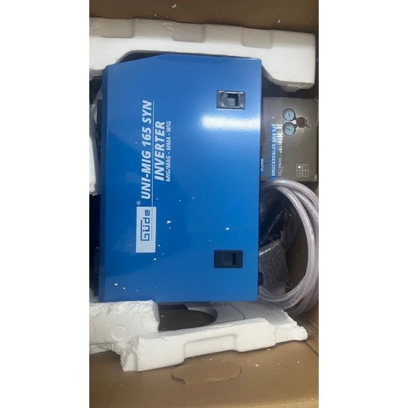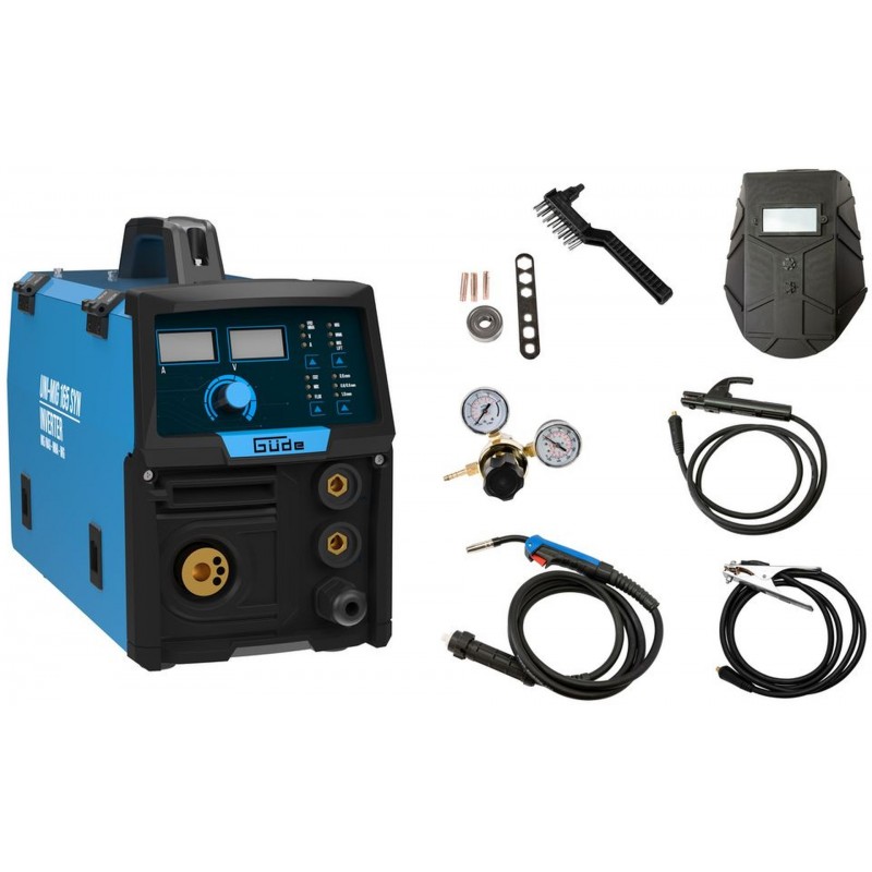 Invertorová zváračka Uni-Mig 165 SYN patrí medzi univerzálne invertorové zváračky v produktovom rade spoločnosti Güde. So zváračkou Uni-Mig 165 SYN sú možné prakticky všetky štyri zváracie procesy: MIG-MAG, MMA (zváranie elektródou), Flux (zváranie plneným drôtom), aj zváranie WIG (voliteľné). Osvedčené doplnkové vlastnosti ako Anti-Stick (zabraňuje prilepeniu elektródy k obrobku), Hot Start (pre optimálne zapaľovanie elektródy) a Arc Force (stabilizuje oblúk automatickým nastavením zváracieho prúdu a zaisťuje tak dokonalé výsledky zvárania) zaisťujú maximálny komfort pri zváraní, a to aj v náročných podmienkach. Nový, inovatívny synergicky regulovaný posuv drôtu sa po výbere procesu zvárania, hrúbky drôtu a sily zvárania automaticky nastaví na správnu rýchlosť. Tieto doplnkové funkcie umožňujú najmä začiatočníkom a neskúseným zváračom okamžite dosiahnuť dobré výsledky zvárania. Držiak elektród a ukostrovacia svorka, ako aj kladivo s kefou pre procesy MMA sú súčasťou štandardnej výbavy. To isté platí aj pre horák MIG/MAG a regulátor tlaku na ochranný plyn. Vhodná na malé cievky a plastové cievky D200 (5 kg). Kryt vyrobený z oceľového plechu s povrchovou úpravou práškovaním, tepelná ochrana proti preťaženiu. Trojmetrový hadicový zväzok s Euro prípojkou (MB15), 1,2-metrový uzemňovací kábel s ukostrovacou svorkou, 1,8-metrový držiak elektród. Prúdová tryska (0,8 mm), 1 plynová tryska. Dvojhodinový reduktor tlaku, plynová hadica. Vrátane zváračského štítu a kladiva na trosku s kefkou. Doba zapnutia pri maximálnom zváracom prúde 230 V (MMA/MIG/MAG/WIG): 30%.