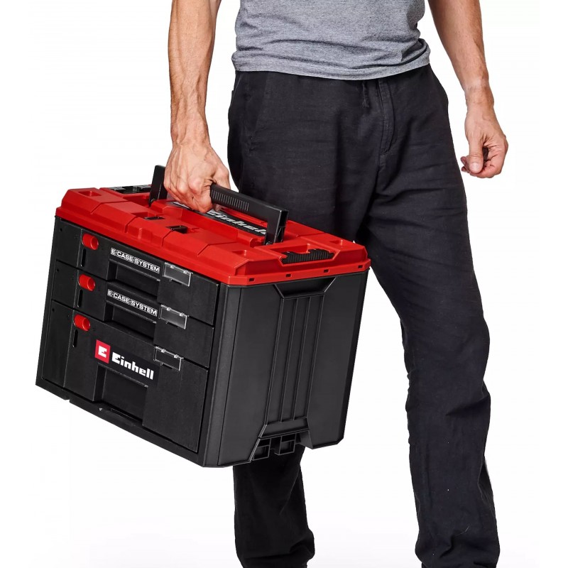 Kufor Einhell E-Case so zásuvkami je súčasťou modulárneho systému E-Case a udržiava všetko prehľadne usporiadané v každej situácii. Robustný systémový kufor je možné bezpečne stohovať a vďaka premyslenému uzamykaciemu systému ho možno kombinovať aj s kuframi E-Case Half-size. Má tri pevné zásuvky: dve menšie zásuvky (výška: každá 5,5 cm) sú ideálne na skrutky, hmoždinky alebo iné drobné diely, zatiaľ čo veľká spodná zásuvka (výška: 12,5 cm) ponúka priestor aj pre elektrické náradie, ako sú akumulátorové skrutkovače alebo uhlové brúsky. Každá zásuvka unesie až 20 kg. Kufor odolá celkovému zaťaženiu zhora až do max. 1 000 kg.