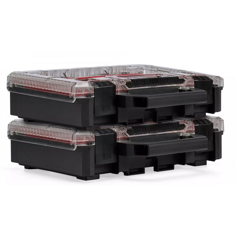 Organizér obsahuje 4 triediace boxy: tri malé a jeden veľký box s prepážkami umožňujú prehľadné uloženie skrutiek, hmoždiniek a podobne.